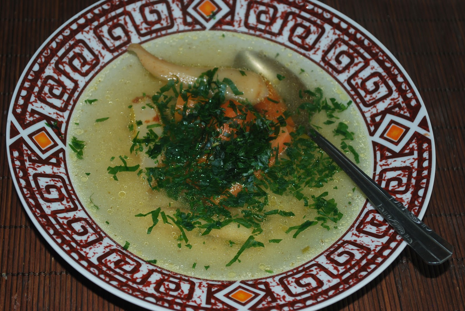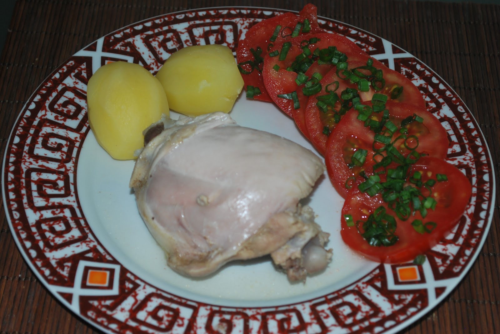Rosołek z warzywami i dużą ilością pietruszki (bez makaronu), 2 ziemniaczki z wody (bez masła), udko kurczakowe (gotowane i BEZ SKÓRY!), pomidorek ze szczypiorkiem (bez soli), a na deser malinowo-jogurtowy lód domowej roboty.