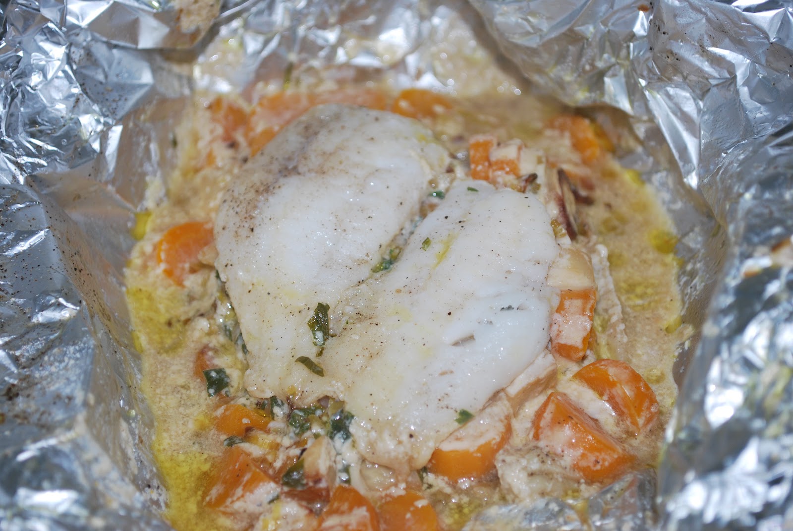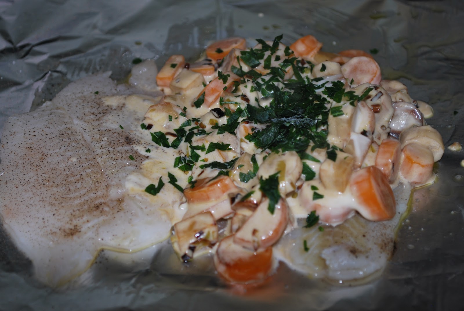 Arkusze folii aluminiowej posmarować lekko tłuszczem (olej lub oliwa z oliwek). Kłaść na każdym po 2 filety ryby przełożone warzywnym farszem.