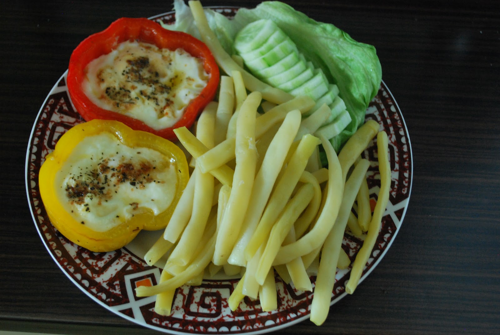 Papryki umyć i pokroić poprzecznie tak, by powstały 4 krążki (2 czerwone i 2 żółte). Położyć na rozgrzaną teflonową patelnię wysmarowaną tłuszczem, przykryć i smażyć minutkę. Odkryć, przewrócić papryki na drugą stronę i wbić do każdego krążka po jajku. Przyprawić przyprawami jakimi kto lubi (może to być np. sól, pieprz, bazylia, cebulka czy przyprawa włoska). Przykryć i smażyć, aż jajka się zetną. Fasolkę szparagową opłukać, oczyścić (ja obcinam oba końce) i ugotować w osolonej wodzie do miękkości (20-30 minut). Sadzone jajka podawać z gotowaną fasolką szparagową i pokrojonym ogórkiem na liściu sałaty.