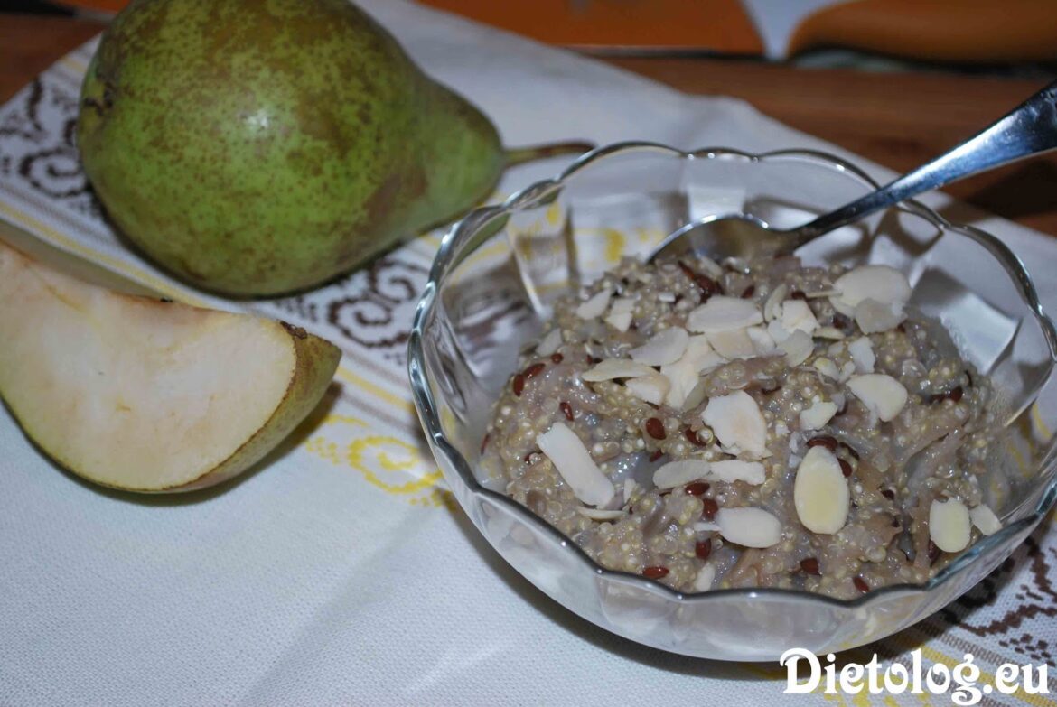 Gruszkę obrać, 1/4 grubo posiekać i ugotować w wodzie z ziarnem quinoa, siemieniem, słonecznikiem i solą. Gotować 15 minut. Zjeść ze startą pozostałą częścią gruszki, płatkami migdałowymi i mlekiem.