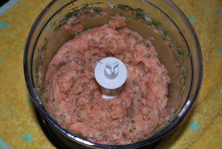 Łososia, szalotkę i koperek włożyć do robota kuchennego i zmiksować na gładką masę (puree). Dodać białka, przyprawić do smaku solą, pieprzem i papryką. Powtórnie zmiksować.
