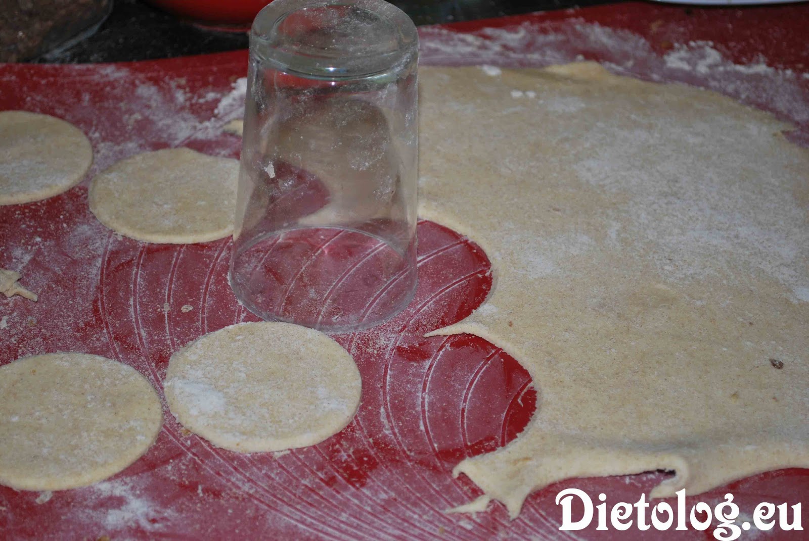 wygodniej rozwałkować) i wycinamy szklanką okrągłe placuszki. Na każdym