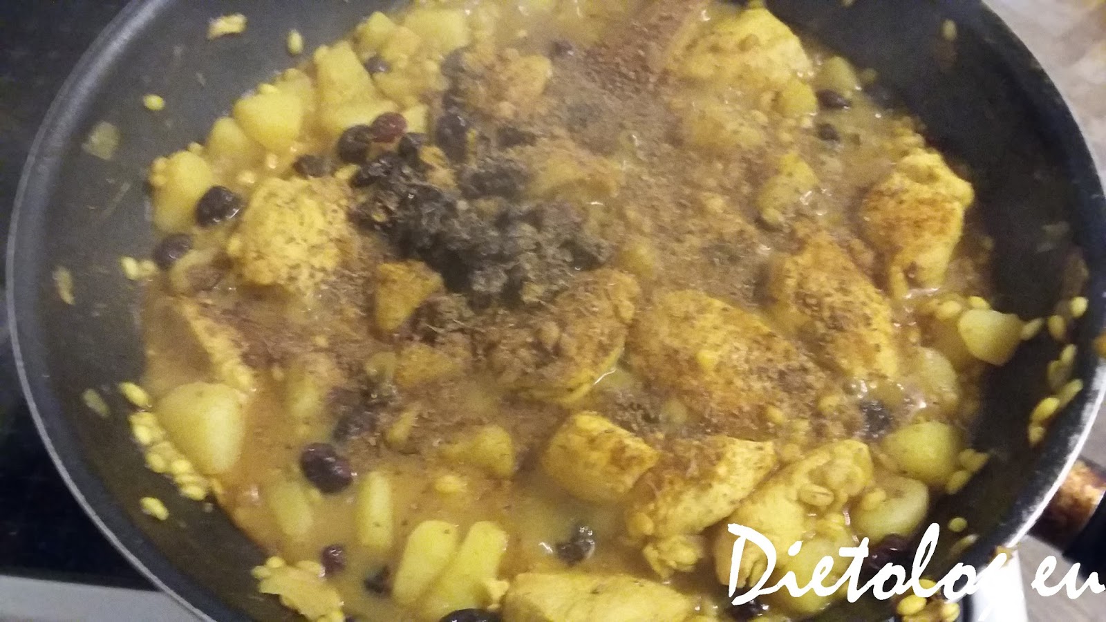 Na patelni na łyżce oleju przesmażamy pokrojonego kurczaka na kawałki, smażymy chwilę i dodajemy pokrojone w kostkę ziemniaki (o ile dodajemy ziemniaki) i pokrojoną drobno lub w piórka cebulę. Następnie dodajemy przyprawy: curry, mielony kminek, kurkumę oraz liście laurowe, a po chwili surową kaszę pęczak. Wszystko razem chwilę smażymy i sukcesywnie zalewamy wrzącym bulionem – tak jak risotto, dolewając w kilku partiach bulion, żeby kasza „piła” go partiami. Dodajemy też żurawinę i miechunkę.