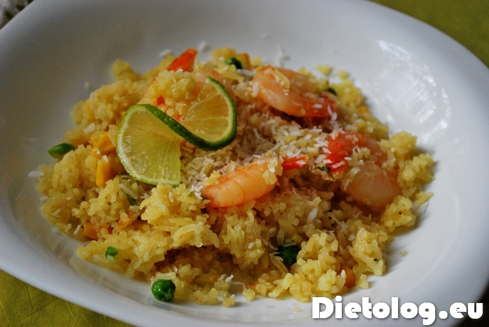 Ryż przepłukać na sicie i dokładnie odsączyć. Na patelni rozpuścić olej kokosowy, zeszklić na nim cebulkę, dodać czosnek i pastę curry. Po chwili dodać ryż i dokładnie wymieszać. W rzucić krewetki i doprawić do smaku solą, pieprzem i przyprawami, dokładnie wymieszać i zalać wrzącym bulionem.