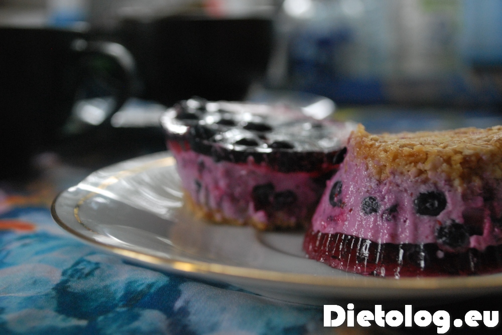 Przepis jest modyfikacją sernika na zimno z truskawkami, to ciasto to cieszy się olbrzymią popularnością wśród moich gości. Owsiany spód z masłem orzechowym smakuje wybornie, słodycz w serze nadają borówki, no i galaretka na wierzchu. Można zrobić ciasto w tortownicy, ale ja wpadłam na pomysł wykorzystania silikonowych babeczek (tylko trzeba ich mieć dużo) i wyszły mi z nich takie oto cudeńka.