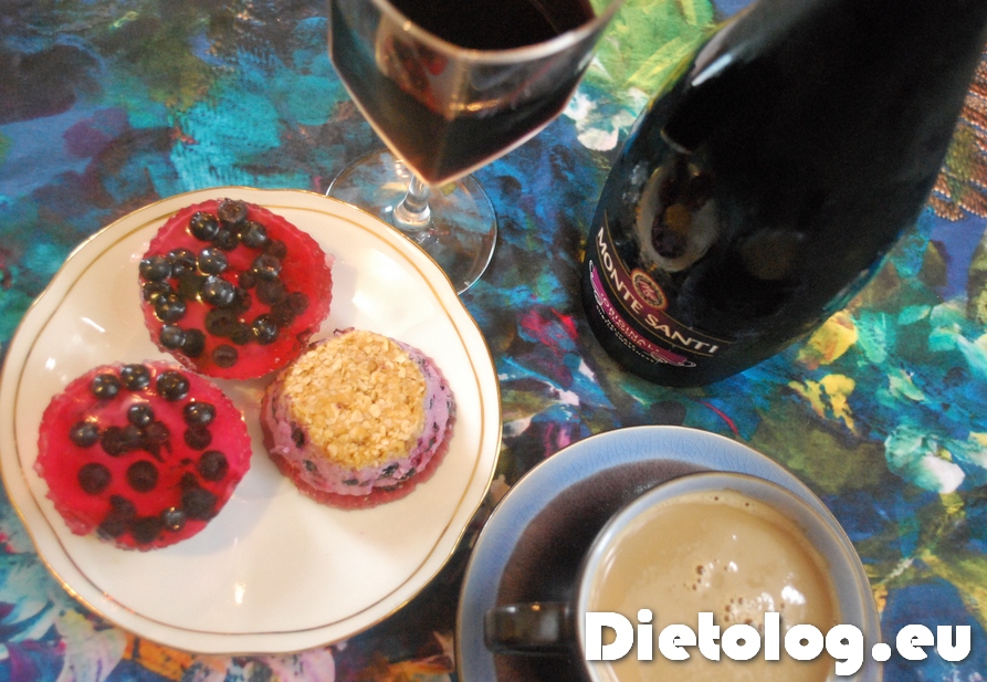 Po ciężkim dniu, a taki był (niebawem dowiecie się dlaczego) należą nam się babeczki i … idealnie komponujące się z deserami owocowe i lekkie winko Monte Santi. U mnie w wersji original, ale widziałam dziś w Biedronce o smaku Blueberry. Całkiem fajne winko w przystępnej cenie. Co prawda nie jestem koneserem, w sumie to rzadko pijam alkohol, ale jeśli już, to wybieram lampkę czerwonego lub różowego, niezbyt ciężkiego wina. Pewnie zaraz zapytacie, czy osoba z cukrzycą powinna pić alkohol? Odpowiem, że wszystko jest dla ludzi w odpowiednich ilościach, bardzo podobnie jak ze słodyczami. Oczywiście odradzam upajanie się alkoholem, ale od czasu do czasu, można sobie pozwolić.