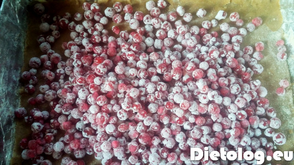Przygotować kruche ciasto łącząc ze sobą i wyrabiając 180g mąki, 150g masła, 3 żółtka (białek nie wyrzucać, przydadzą się do bezy) i 50g ksylitolu. Powstałe ciasto rozwałkować i przełożyć na dno natłuszczonej blaszki wyłożonej folią aluminiową lub papierem do pieczenia. Jeśli trochę zostanie, nie wyrzucać, można utrzeć na wierzchu ciasta.