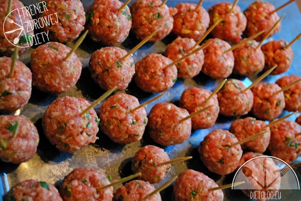 Zmielone siemię lniane dodać do mieszanki i dokładnie wymieszać. Formować zgrabne mięsne kuleczki i układać w naczyniu żaroodpornym. W każdą kulkę wbić wykałaczkę namoczoną w wodzie i wstawić do piekarnika nagrzanego do 180 stopni. Piec około 25 minut.