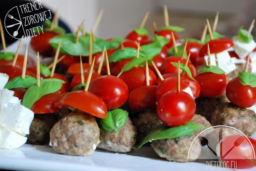 Bazę koreczków wyjąć z piekarnika i ostudzić. Przed przyjęciem ponabijać na wykałaczki listki bazylii i pomidorki koktajlowe. Można spróbować nabić tez fetę (ale z doświadczenia wiem, że się rozpada) albo łatwiej będzie z kuleczkami mozzarelli. Ja pokroiłam fetę i ułożyłam obok mięsno pomidorowych koreczków.