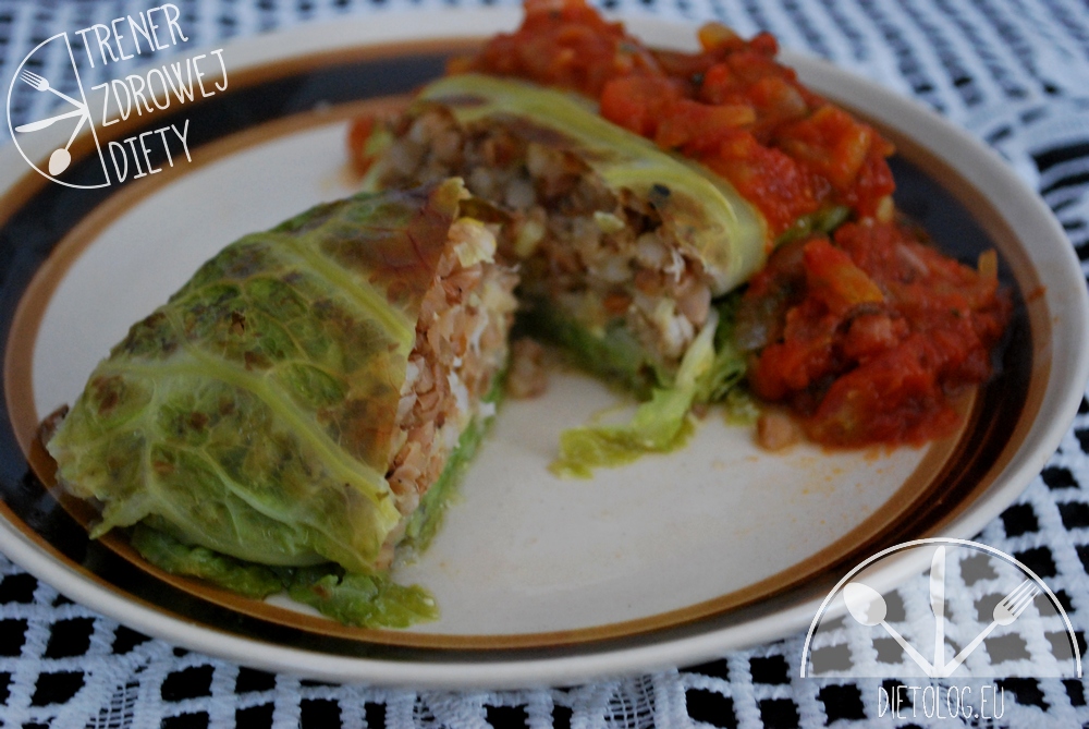 Gołąbki same w sobie to bardzo smaczne danie, jednak ja postanowiłam nadać im nieco inną, nowoczesną formę. Nie jestem fanką mięsa wieprzowego i rzadko używam sosów z zasmażką. Zamiast mięsa w farszu znajdziecie rybę – w końcu mamy Fish Friday (w piątki u mnie przepisy na dania rybne), zamiast białego ryżu z wysokim indeksem glikemicznym proponuję kaszę gryczaną (i trochę pęczaku, ale głównie dlatego, że miałam ugotowany) i liście kapusty włoskiej. Takim sposobem zapraszam Was na gołąbki w mojej autorskiej, rybnej odsłonie.