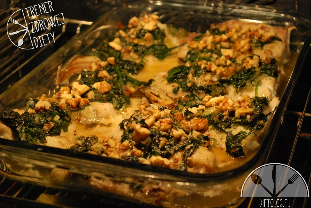 Wyłożyć duszony szpinak na wierzch każdej porcji ryby. Posypać pokruszonymi orzechami włoskimi. Naczynie przykryć, żeby ryba podczas pieczenia nie wyschła. Piec 20 minut w temperaturze 160 stopni.