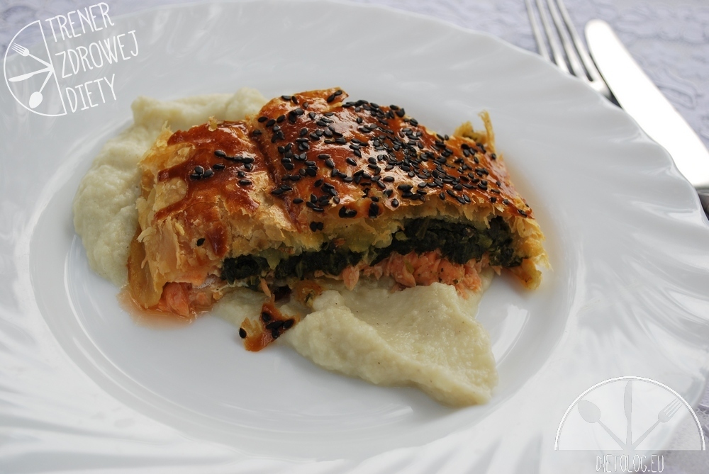 Ostatni piątek tego roku i zarazem ostatni tegoroczny wpis w ramach Fish Friday chciałabym uczcić łososiem w cieście francuskim na kalafiorowym puree.