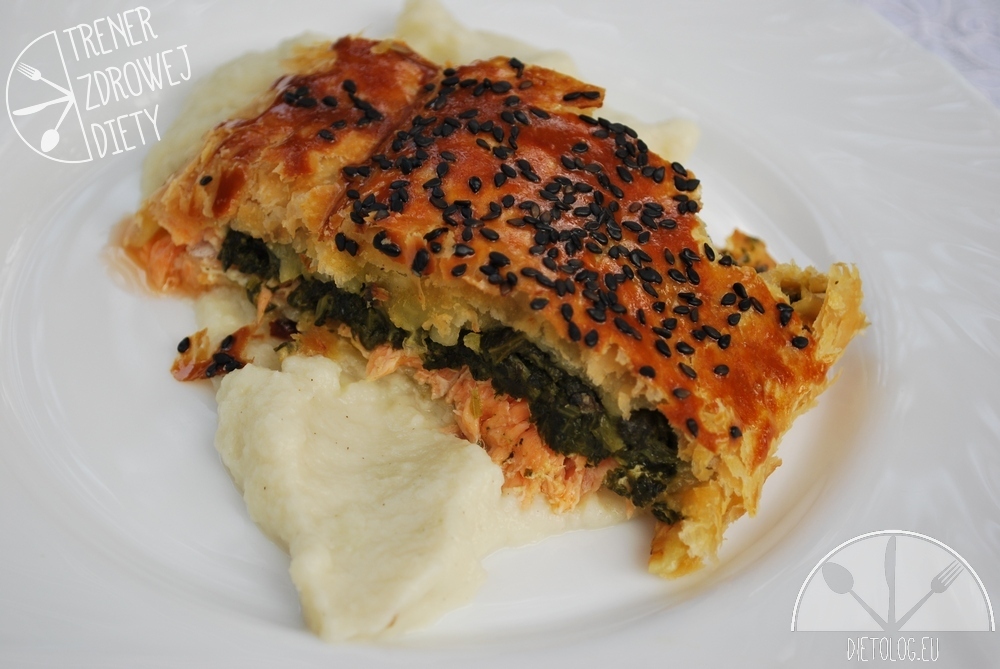 Danie jest absolutnie fantastyczne, delikatny łosoś w rozpływającej się w ustach skorupce z ciasta francuskiego i dopełniające je lekkie „piure z kalafiore”. Gotowe ciasto francuskie jest dostępne w każdym niemal sklepie i dzięki temu danie jest banalnie łatwe do przygotowania, a wygląda i smakuje wykwintnie.