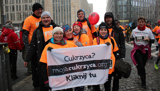 Na ciepłe (4-warstwowe) ubranie piękna pomarańczowa koszulka biegowa, do jednej kieszonki glukoza w płynie, do drugiej czytnik Libre, a na nadgarstek opaska z informacją o cukrzycy. Do ręki rączka córki i w drogę. Bardzo się cieszę, że wzięłam udział w tym biegu. Satysfakcja duża i to uczucie, gdy się biegnie wśród tysięcy biegaczy w takich samych koszulkach. Naprawdę, to robi wrażenie 🙂