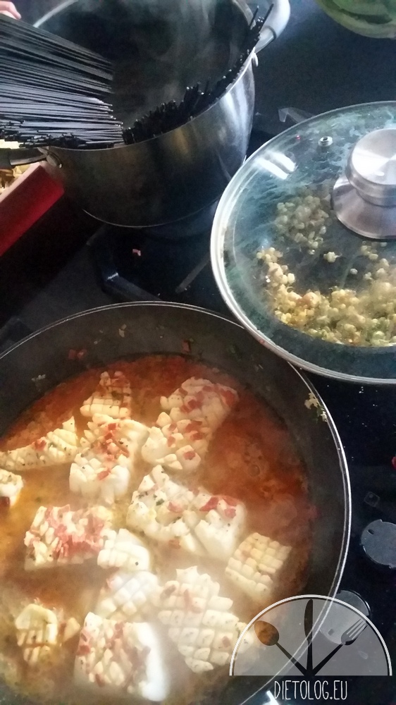Ugotowałam czarny makaron barwiony sepią – ma lekko rybny smak, więc idealnie się komponuje z owocami morza.