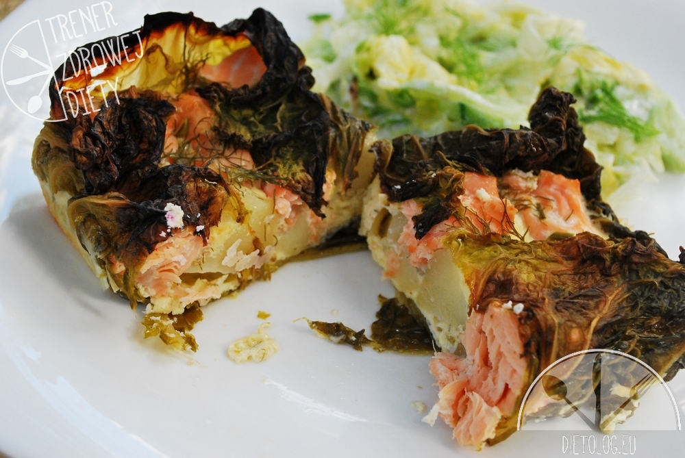 Lubicie łososia? Poszukujecie nowego przepisu na danie z tą smaczną rybą? Koniecznie wypróbujcie ten przepis. Możecie wykorzystać także nieco tańszego pstrąga łososiowego, efekt będzie podobny. Ja użyłam łososia atlantyckiego, udało mi się kupić świeżego i sprężystego fileta. Rybę połączyłam z młodymi ziemniaczkami, pęczkiem koperku i zapiekłam w liściach kapusty włoskiej. Danie jest proste i szybkie w przygotowaniu, trochę przypomina gołąbki, lecz zaskakuje nieoczywistym połączeniem ryby z kapustą. Zresztą, sprawdźcie sami. Polecam.